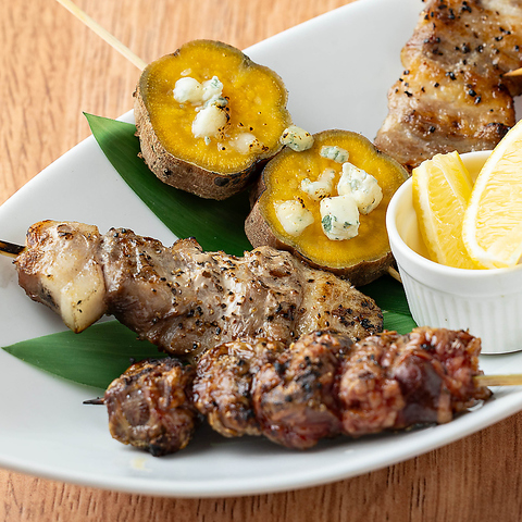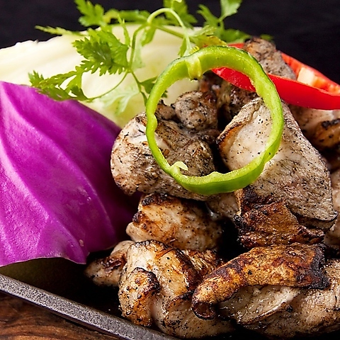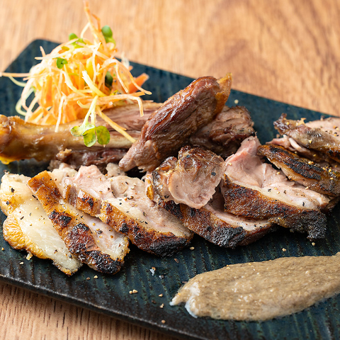 粗びき胡椒とが岩塩で味を調え炭火でジューシーに焼き上げます。仕上げはアクセントのアンチョビパン粉。